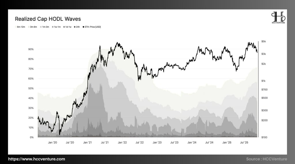 Realized Cap HODL Waves của Ethereum cho thấy cấu trúc nắm giữ hiện tại đang dịch chuyển mạnh vào các nhóm ≥6 tháng, đồng thời tỷ trọng nguồn vốn thuộc nhóm <1 tháng giảm đáng kể so với giai đoạn hình thành đỉnh 2021.