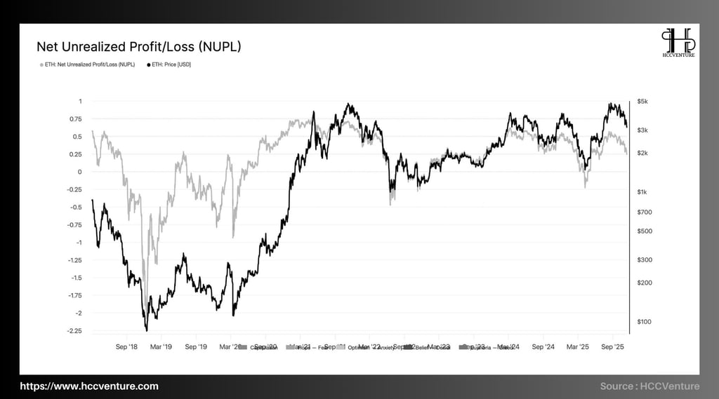 Chỉ số NUPL của Ethereum hiện đang duy trì trong vùng dương nhẹ, dao động xung quanh mức 0.20–0.35. So với các giai đoạn trước, ETH đang ở trong khu vực “Optimism – Belief”, thấp hơn đáng kể so với các vùng “Euphoria” giai đoạn 2021 (NUPL > 0.6), và cao hơn vùng “Capitulation” năm 2022 (NUPL < –0.3).
