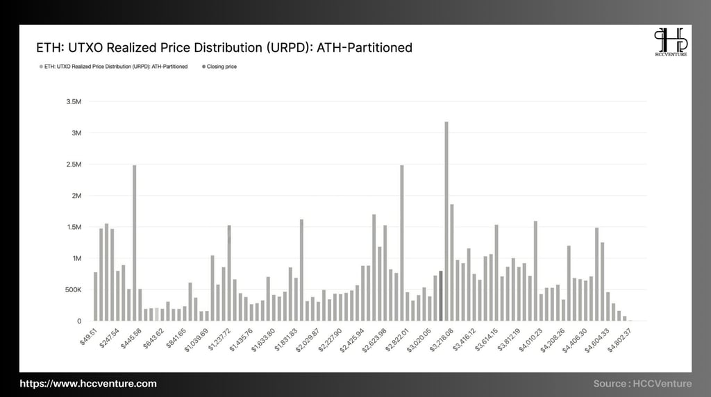 Từ dữ liệu URPD, có thể thấy các cụm 1.200–1.450 USD và 1.800–2.200 USD duy trì mật độ cung tương đối dày (0.5–1.2 triệu ETH mỗi vùng). Đây là số lượng lớn holder tham gia vào chu kỳ phục hồi 2023–2024, phần lớn vẫn chưa phân phối ngay cả khi ETH đạt các mốc 4.000–4.800 USD.