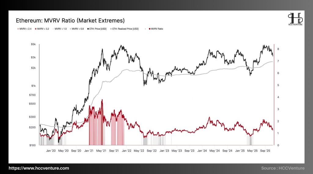 Giai đoạn 2023-2025, MVRV chủ yếu dao động quanh 1.0–1.8, phản ánh ETH không còn bị định giá rẻ như giai đoạn 2022, cũng không xuất hiện sự hưng phấn vượt chuẩn như 2021 và thị trường đang trong một pha tái thiết lập cấu trúc cung–cầu.