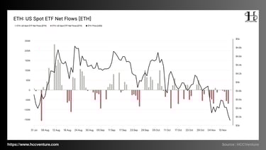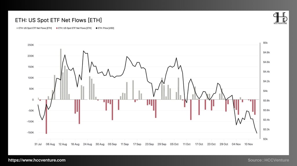 Dòng vốn ròng (Net Flows) của các US Spot ETH ETF đã chuyển từ trạng thái tích cực trong tháng 8 sang xu hướng suy yếu kéo dài từ giữa tháng 9 đến tháng 11. Trong khi giai đoạn đầu ETF thu hút dòng vốn mạnh, với những ngày ghi nhận mức tăng ròng trên +150.000 ETH, thì giai đoạn cuối biểu đồ cho thấy các đợt rút vốn liên tục, nhiều phiên giảm sâu hơn –120.000 ETH.