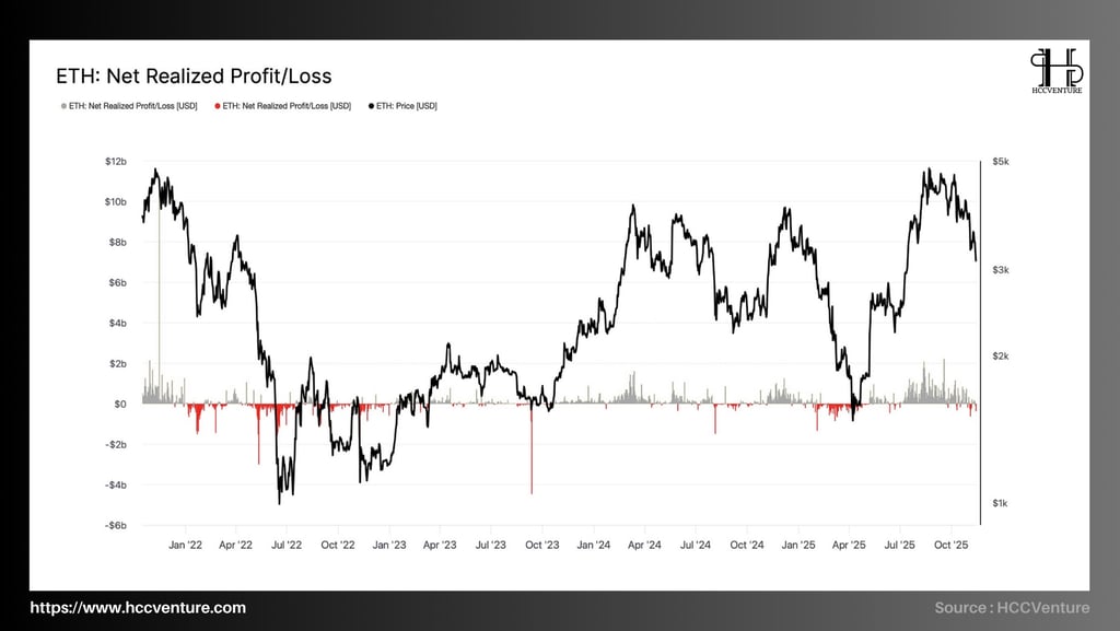 So sánh lịch sử cho thấy những pha giảm sâu thực sự của ETH luôn đi kèm lỗ thực hóa trên -4,5 đến -6 tỷ USD, điều chưa xuất hiện trong chu kỳ hiện tại.