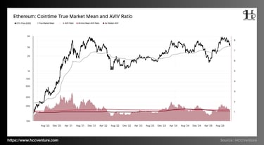 Nhóm chỉ số định giá dài hạn như True Market Mean và AVIV Ratio cho thấy ETH đã quay về gần vùng giá trị nội tại sau nhịp tăng nóng trước đó. AVIV Ratio đang giảm về sát đường trung vị 4 năm, phản ánh ETH đang rời khỏi vùng định giá đắt, tiến tới trạng thái được định giá hợp lý hơn.