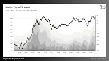 Realized Cap HODL Waves cho thấy sự gia tăng đáng kể của nhóm coin ngắn hạn (1d–1w, 1w–1m), phản ánh tốc độ dịch chuyển coin cao và tâm lý không còn nắm giữ dài hạn.