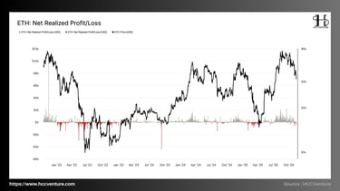 Điều này có thể đến từ Lợi nhuận chưa thực hóa được điều chỉnh về mức hợp lý. Nhà đầu tư chốt lời ở mức kiểm soát, không tạo ra cú xả mạnh toàn thị trường. Realized Cap tiếp tục tăng ổn định, chứng minh dòng tiền dài hạn vẫn tích lũy ETH.