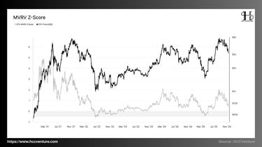 Nếu True Market Mean là thước đo định giá trễ (lagging fair-value), thì AVIV Ratio là thước đo động lực dẫn dắt. Trong khi AVIV cao cho thấy dòng vốn on-chain mạnh, giai đoạn tăng trưởng (2020–2021). Ngược lại, AVIV thấp lại giảm tốc độ giao dịch thực, phù hợp giai đoạn tích lũy.
