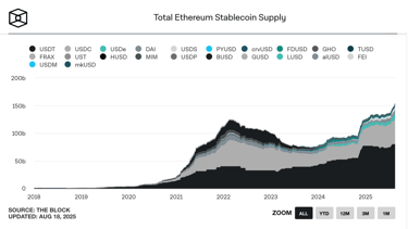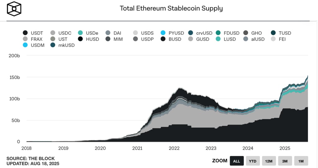 Biểu đồ của The Block, được cập nhật lần cuối vào ngày 18 tháng 8 năm 2025, cho thấy số lượng stablecoin trên Ethereum đã tăng trưởng đáng kể kể từ năm 2018. Đã có một sự tăng đột biến vào năm 2021, và con số này vẫn tiếp tục tăng kể từ đó. Nguồn cung đã tăng thêm 378 triệu đô la trong 24 giờ, nâng tổng giá trị lên hơn 150 tỷ đô la. Điều này một phần là do ngày càng có nhiều người sử dụng stablecoin cho giao dịch, tài khoản và đầu tư. Các stablecoin lớn nhất, như Tether (USDT) và Circle (USDC), đóng góp phần lớn vào sự tăng trưởng này. Các stablecoin khác, như DAI, PYUSD và crvUSD, cũng đóng góp đáng kể.