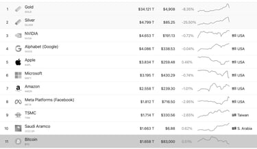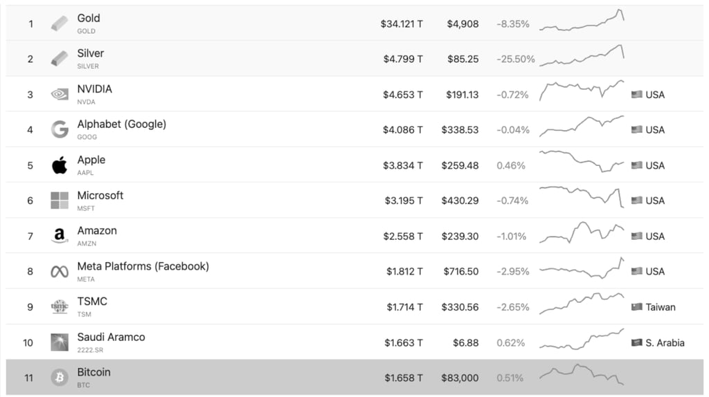 Tính đến ngày 29 tháng 1 năm 2026 (12 giờ trưa UTC), vốn hóa thị trường của Bitcoin đạt khoảng 1,78–1,82 nghìn tỷ USD, xếp thứ 11 toàn cầu — sau: