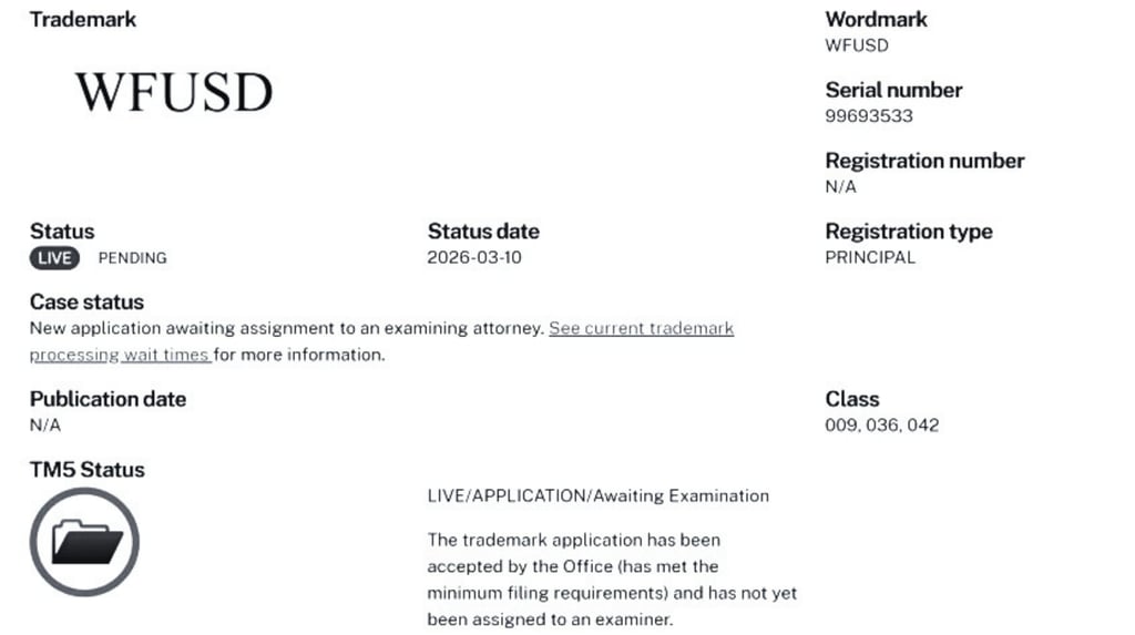Wells Fargo & Company đã nộp đơn lên Văn phòng Sáng chế và Thương hiệu Hoa Kỳ (USPTO) để đăng ký nhãn hiệu "WFUSD" trên nhiều nhóm ngành quốc tế, theo hồ sơ công khai của USPTO được cập nhật ngày 11 tháng 3 năm 2026. Hồ sơ này bao gồm các dịch vụ tài chính, bao gồm: